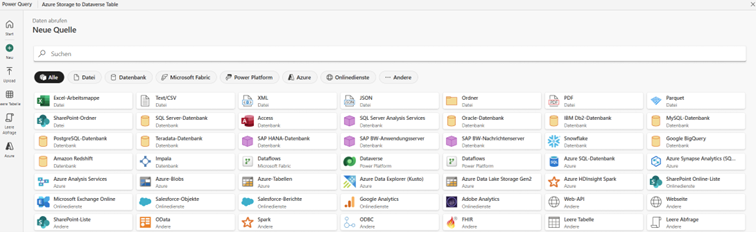 Dann müssen wir dem Data Flow einen sprechenden Namen geben, ich habe es „Azure Storage to Dataverse Table“ genannt. Im nächsten Screen, nämlich „Datenquelle auswählen“ ist die Option nicht direkt sichtbar, wir müssen hier auf mehr Anzeigen klicken: