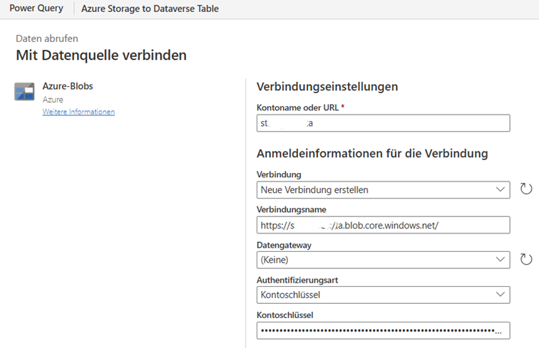 Nach einem Klick öffnet sich die Ansicht „Mit Datenquelle verbinden“. Hier gebe ich zuerst den Namen des Storage Accounts ein. Der Name soll mit dem aus der Azure-Ressource übereinstimmen. Zusätzlich soll unten die Authentifizierungsart auf Kontoschlüssel umgestellt werden.