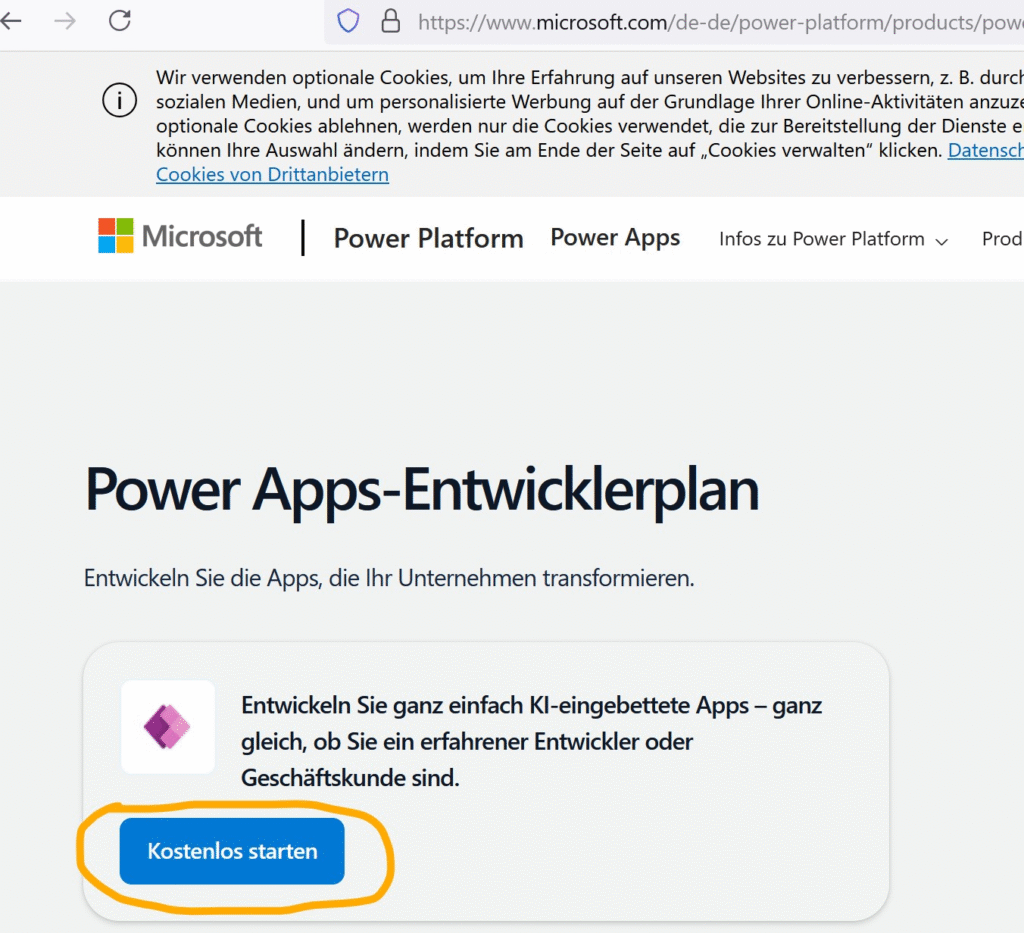 - https://aka.ms/PowerAppsDevPlan öffnen.