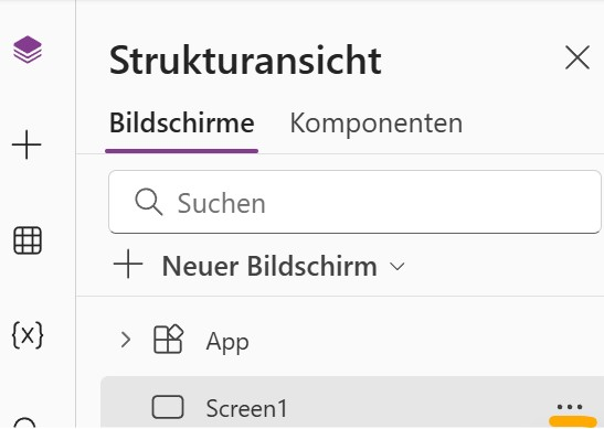 - Um Screen1 umzubenennen, muss dieses Element links in der Strukturansicht ausgewählt werden.