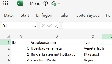 TIPP: Falls hier die Meldung “Die Datei enthält keine Tabellen…” kommt, stelle sicher, dass die Auswahl in Menu.xlsx tatsächlich als Tabelle formatiert wurde (Excel-Option “als Tabelle formatieren”. Ich habe der Tabelle auch einen sprechenden Namen gegeben (Menütabelle), sonst heißt es Tabelle1.