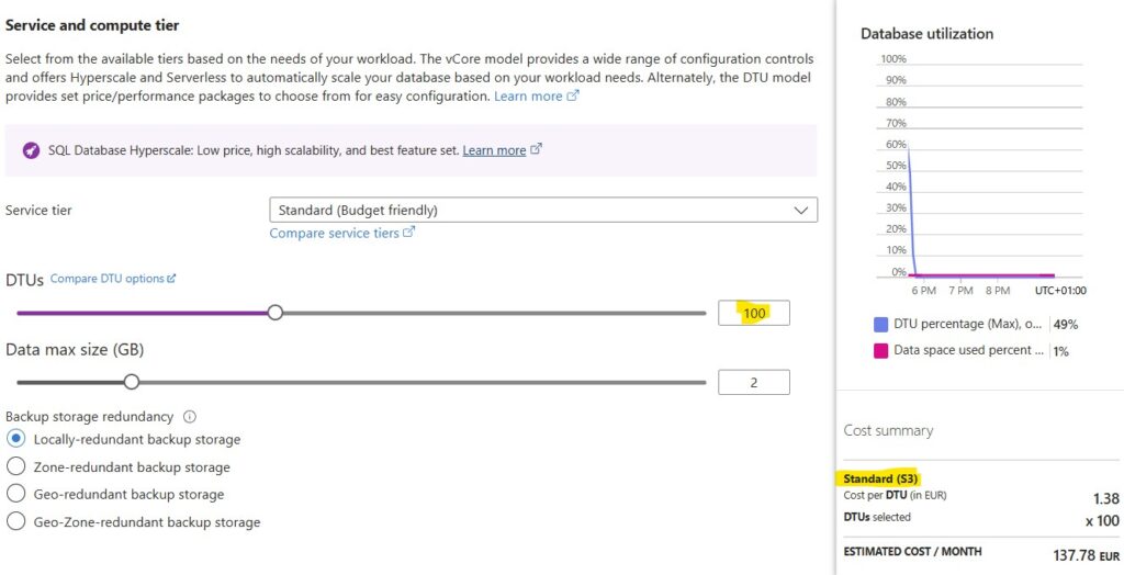 Durch Klick auf „Basic“ gelangt man ins Compute + Storage screen. Hier muss Standard als Service tier ausgewählt werden und mindestens S3 (>= 100 DTU)